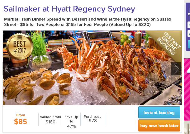 悉尼Hyatt Regency餐厅 双人海鲜晚餐 团购价$85 原价$160