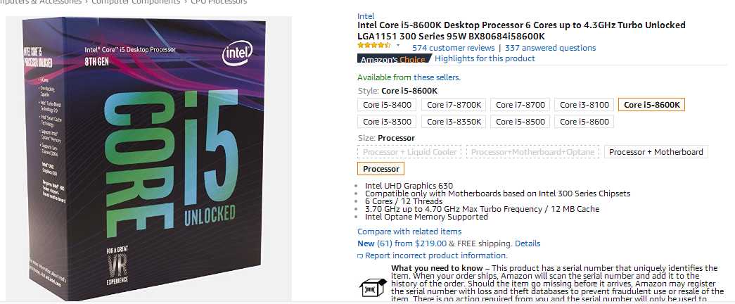 电脑处理器Intel Core i5 8600k 现价$219 USD (~$290 AUD)+邮费 @Amazon US