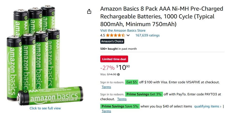 Amazon Basics 8 Pack AAA Ni-MH Pre-Charged Rechargeable Batteries, 1000 Cycle (Typical 800mAh, Minimum 750mAh) 8节AAA镍氢预充可充电电池