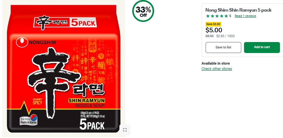Nong Shim 经典辛拉面特价!33%折扣!5包,现价$5.0!@ Woolworths