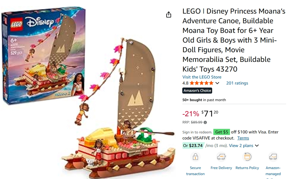 LEGO乐高迪士尼公主莫阿娜的冒险独木舟21%折扣!现价$71 ...