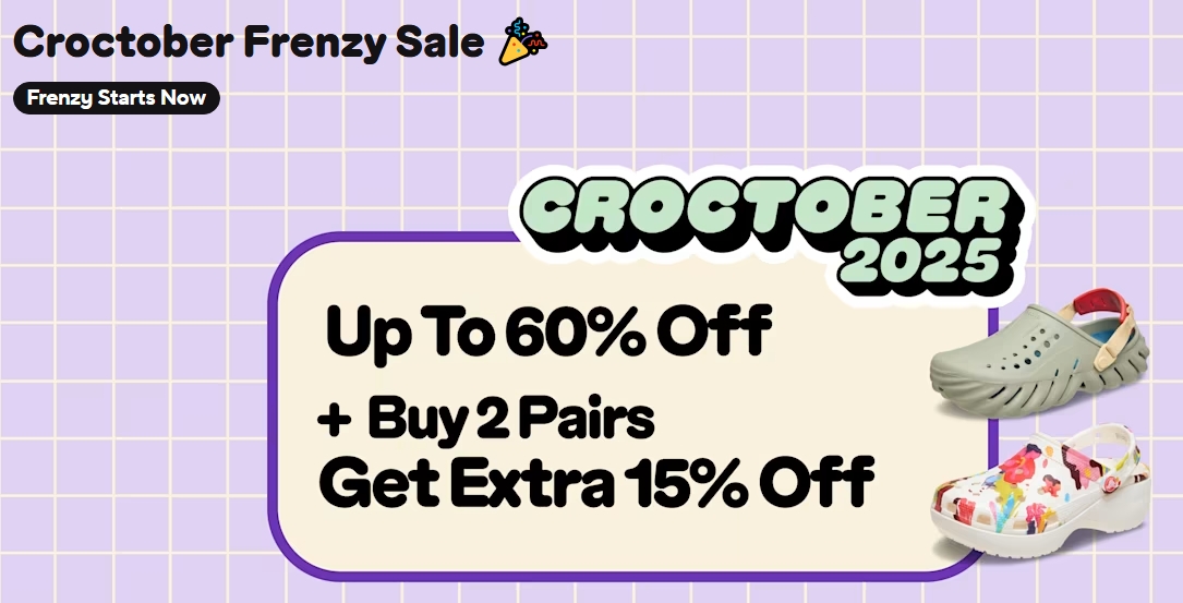Crocs官网十月促销:最高60%折扣!购买两双,还有15%折上折!