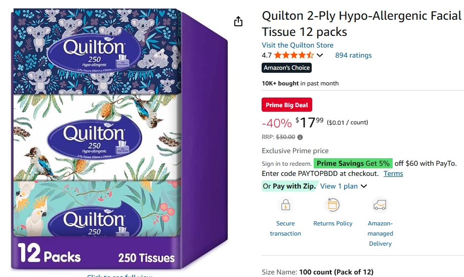 Quilton2层低过敏性面巾纸特价!40%折扣,12包,现价$17.99!@ Amazon