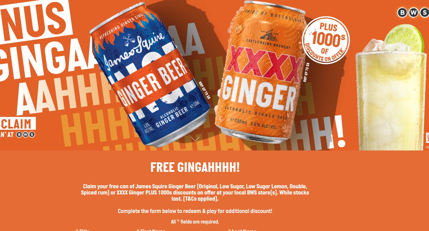 James Squire有一个促销活动,可以获得一个代码,在BWS兑换330毫升的任意James Squire姜汁啤酒或XXXX姜汁啤酒。