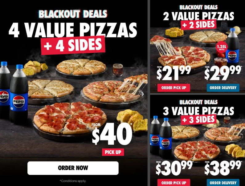 - $6 大份Value 披萨 自提, $8 Value Max, $10 传统披萨 & $12 至尊披萨