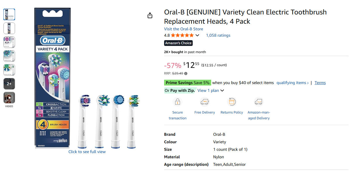 Oral-B [GENUINE] Variety Clean Electric Toothbrush Replacement Heads, 4 Pack 电动牙刷替换头4个装