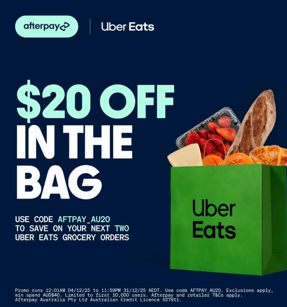 在Uber Eats下两单Grocery Orders订单,消费满$40,减$20!