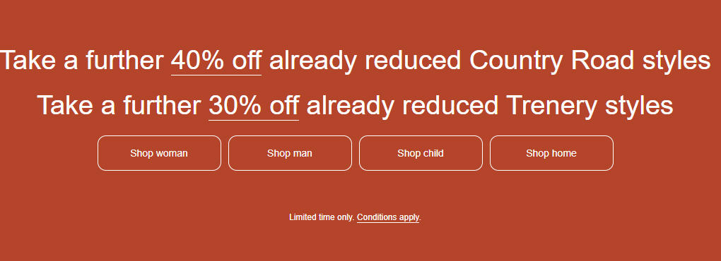 Country Road衣服、家居品促销款:40%折上折!