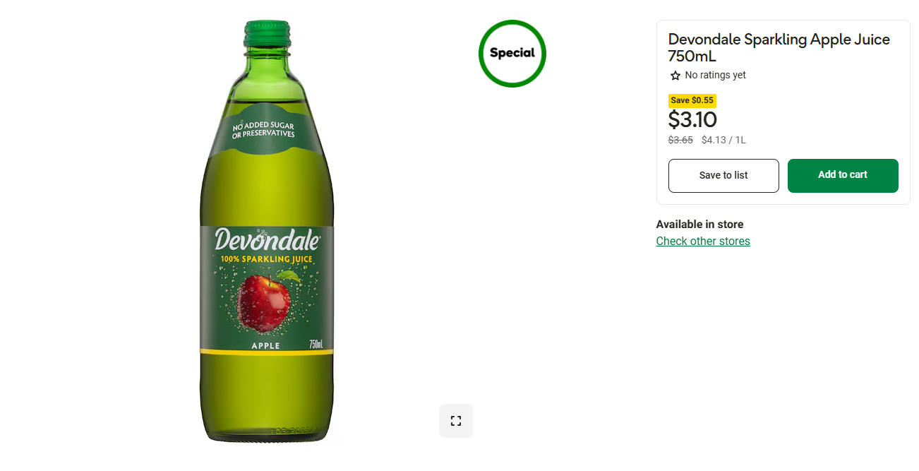 超级好喝的Devondale苹果汁汽水特价!750mL,现价$3.10 ...