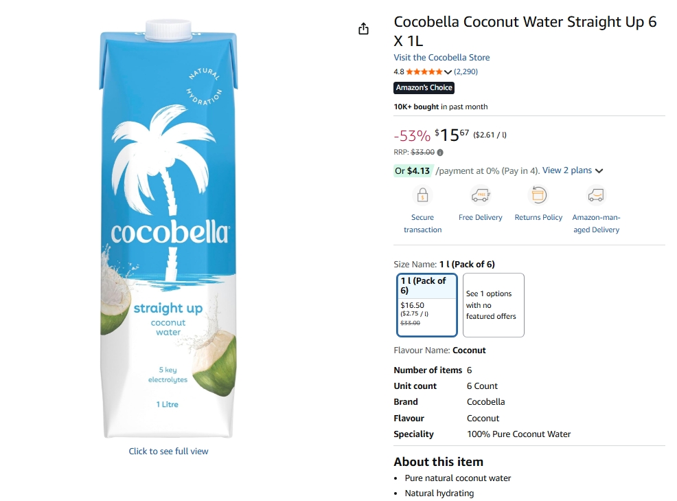 Cocobella直饮椰子水53%折扣!6X1升,现价$15.67!@ Ama ...