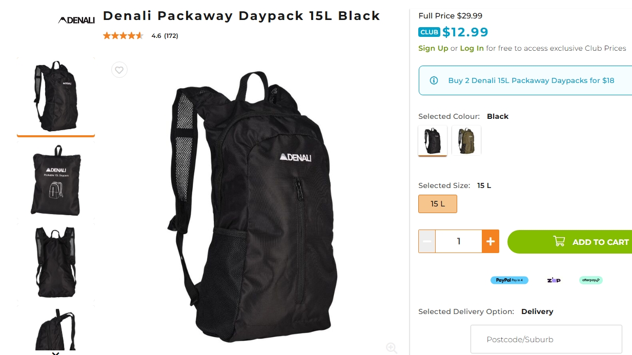 Denali Packaway 15L黑色背包,两件$18!@ Anaconda Stores