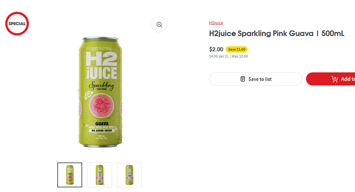 H2juice 气泡番石榴味饮料特价!500mL,30%折扣,现价$2.00!@ Coles