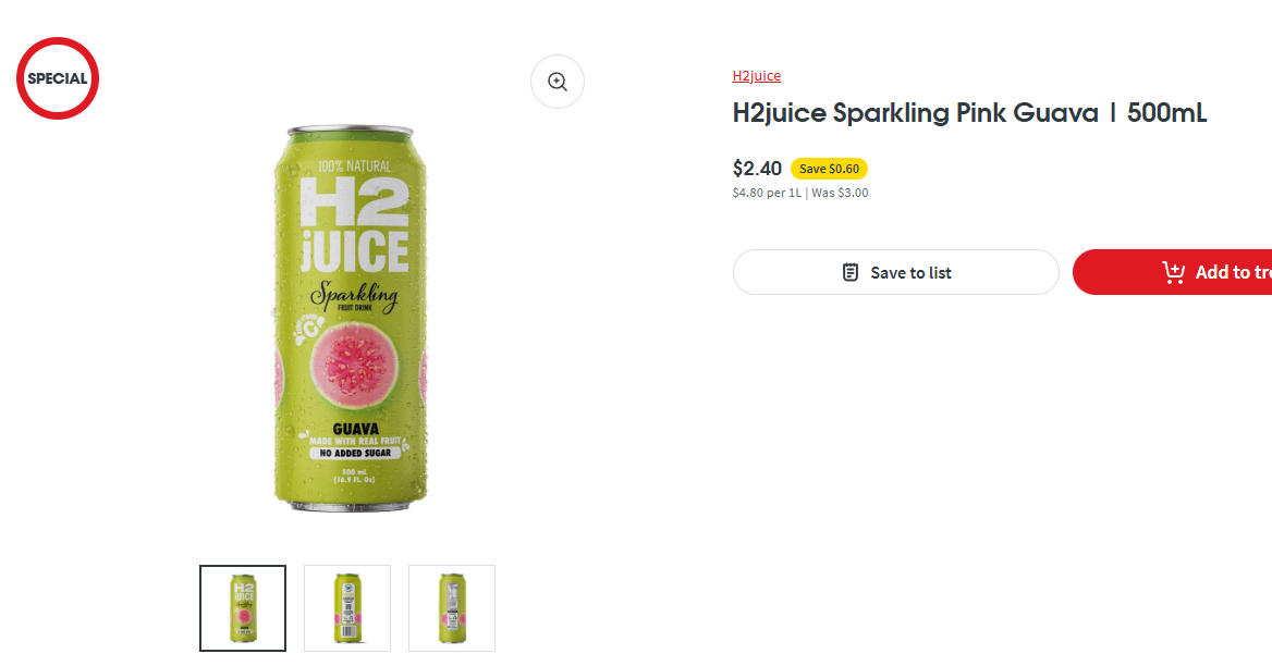 H2juice气泡粉番石榴汁特价!500毫升,现价$2.40,省$0.60!@ Coles