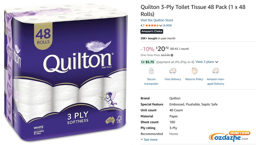 Quilton 3-Ply Toilet Tissue 48 Pack (1 x 48 Rolls) 三层厕纸