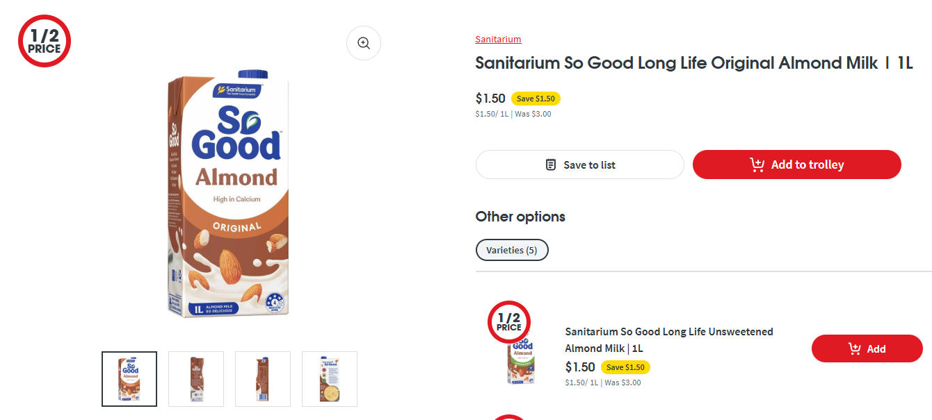 Sanitarium So Good原味杏仁奶半价!1升,现价$1.50!@ Coles