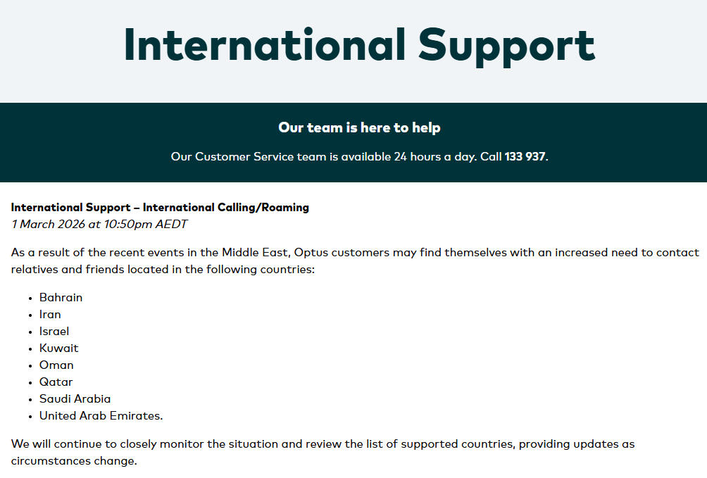 Optus公司将对从 2026 年 2 月 28 日起至该优惠活动终止期间,从澳大利亚拨打至巴林、伊朗、卡塔尔、阿曼、沙特阿拉伯、科威特、以色列和阿拉伯联合酋长国的国际通话及短信费用进行结算。