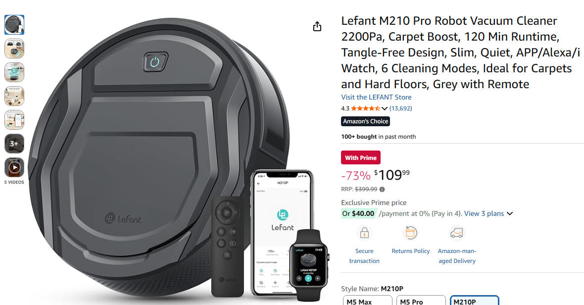Lefant M210 Pro机器人吸尘器73%折扣!现价$109.99!@ A ...