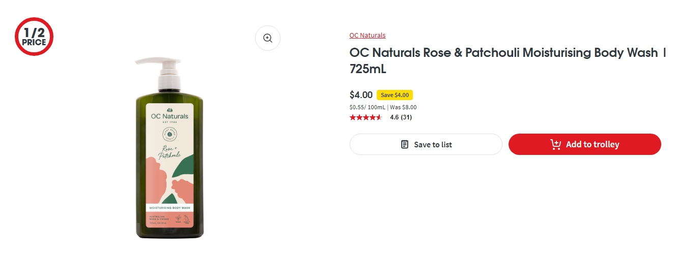 OC Naturals玫瑰与广藿香保湿沐浴露半价!725mL,现价$4.00!@ Coles