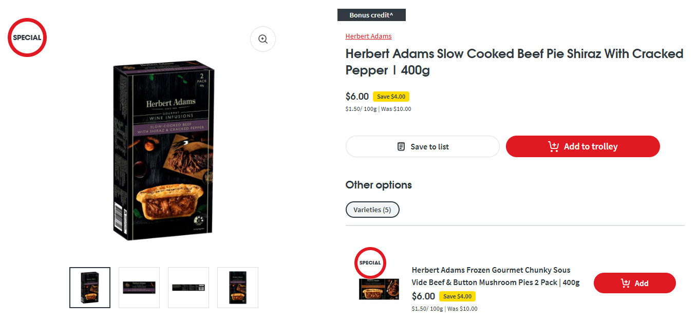 Herbert Adams设拉子红酒黑胡椒慢炖牛肉派特价!现价$6.00,省$4.00!@ Coles