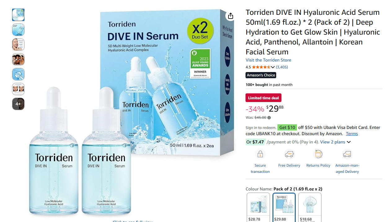 网址:https://www.amazon.com.au/Torriden-Hyaluronic-Hydration-Panthenol-Allantoin/dp/B097PG84S9/ |