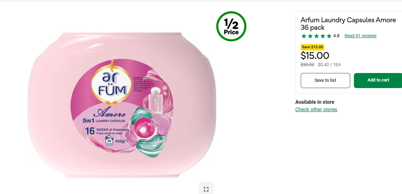 Arfum5合1洗衣凝珠Amore半价!现价$15.00!@ Woolworths ...