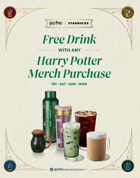 购买任意哈利・波特联名周边商品,即可获赠免费饮品一杯!@ Starbucks