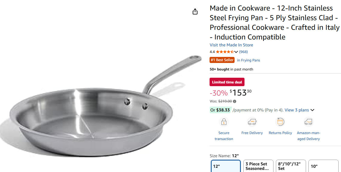 Made in Cookware 5层优质金属制造12英寸不锈钢煎锅,30%折扣!现价$153.30! @ Amazon