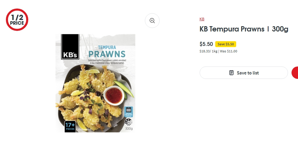 KB天妇罗炸虾半价!现价$5.50!@ Coles