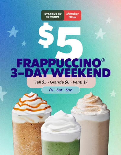 星巴克会员专属星冰乐促销活动:$5星冰乐 3天周末活动!
