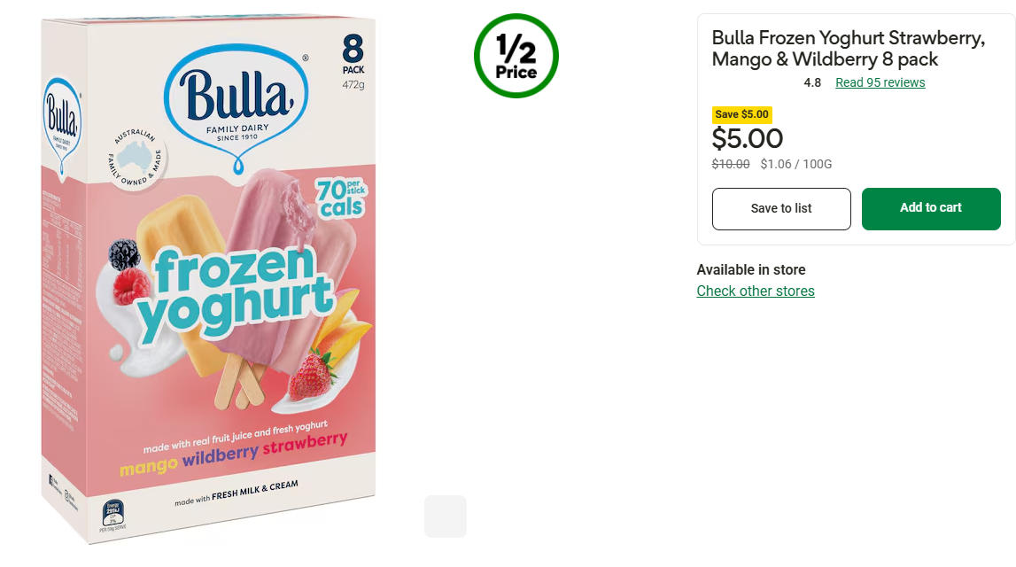 Bulla草莓、芒果与野生莓果口味的冷冻酸奶冰棒半价!8个装,现价$5.00!@ Woolworths